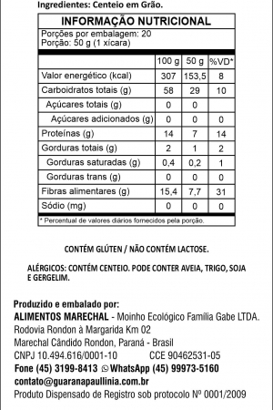 ALÉRGICOS: CONTÉM CENTEIO. PODE CONTER AVEIA, SOJA, TRIGO E GERGELIM, devido ao produto ser manipulado em ambiente onde são processados esses gêneros alimentícios.