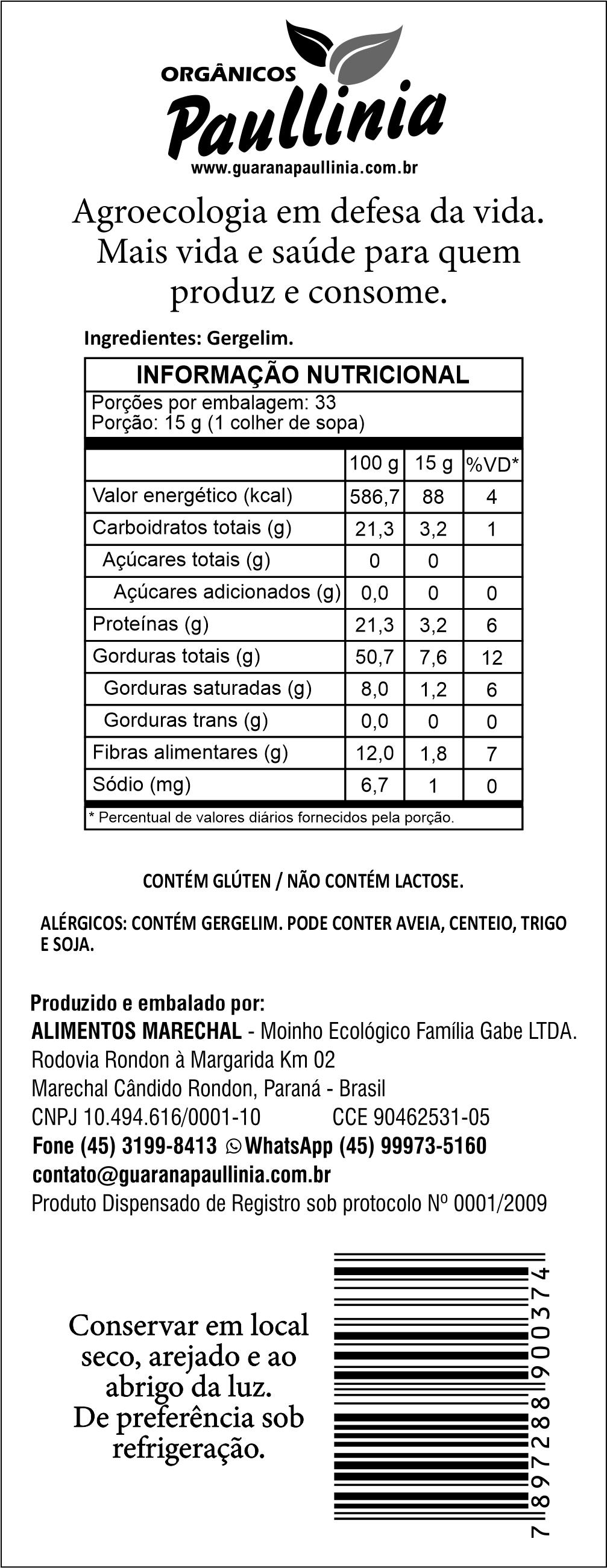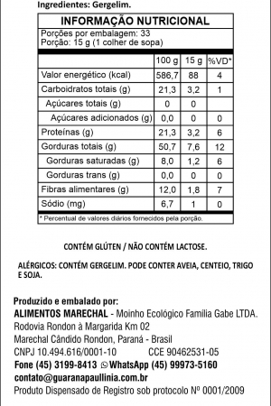 ALÉRGICOS: CONTÉM GERGELIM. PODE CONTER AVEIA, CENTEIO, TRIGO E SOJA, devido ao produto ser manipulado em ambiente onde são processados esses gêneros alimentícios.